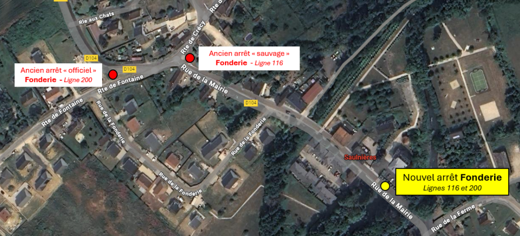 Son nouvel emplacement se situe au niveau de la mairie de Saulnières. Le poteau d’arrêt en bois sera prochainement déplacé. En attendant un poteau d’arrêt provisoire est installé. Il sera desservi par les lignes 116 ET 200.