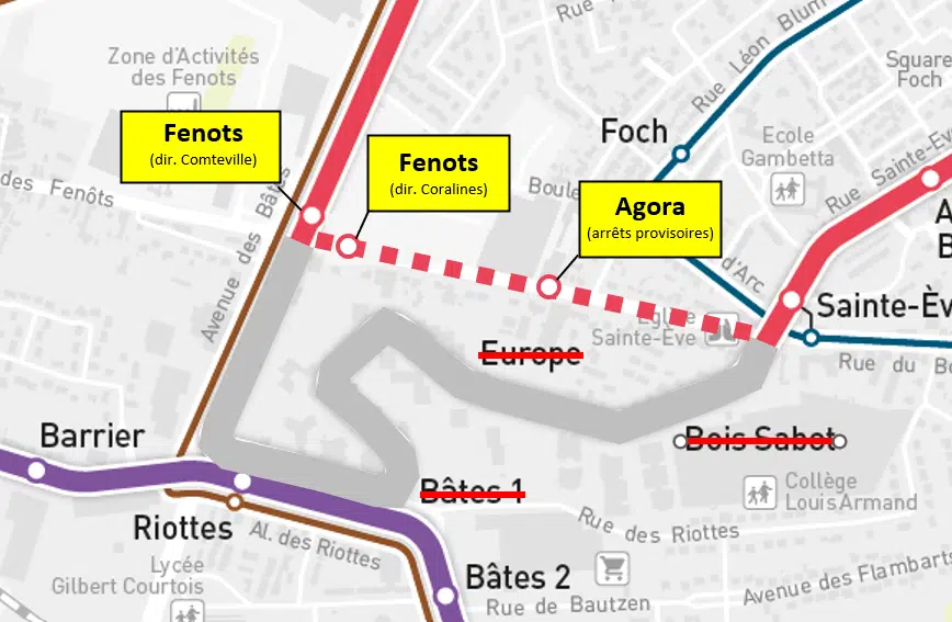En raison des travaux Rue Constantin Gauthier, les arrêts Riottes, Bâtes, Europe et Bois Sabot ne sont pas desservis dans les deux sens à partir du 3 juillet et ce pour une durée indéterminée.